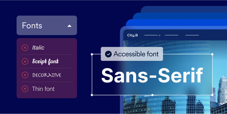 All text content on a website, including headers, body text, and captions, must feature accessible fonts. These fonts have various sizes, weights, and styles to make them easier to read.